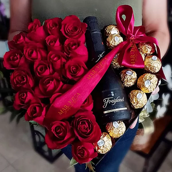 Lindo arranjo composto por 20 botões de rosa, 1 Espumante Freixenet Demi Sec, 12 Bombons Ferrero Rocher em box de coração.
